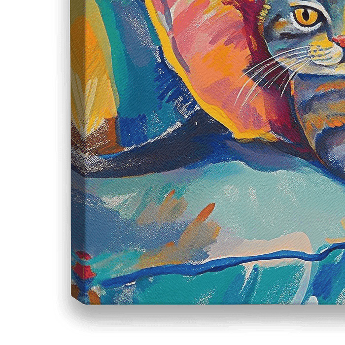 Een kat liggend op een bank in de stijl van een fauvistisch schilderij.