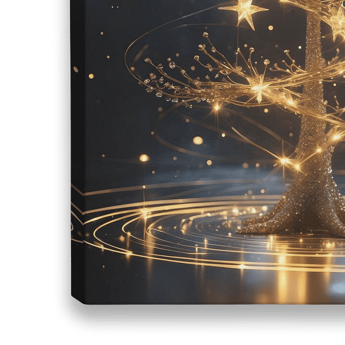 Een boom van licht, geboren uit puur goud en fonkelend sterrenstof. Lumina Arbor vangt het magische moment waarop de nacht zijn adem inhoudt en de wereld badend in goud ontwaakt. De slanke, glinsterende takken dragen sprankelende sterren, die als hemelse juwelen boven de aarde zweven. Elk detail straalt verfijning en elegantie uit, van de zachte gloed rond de kruin tot de subtiele weerspiegeling in de donkere achtergrond.