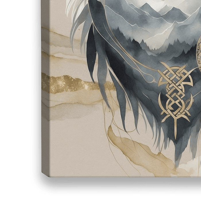 Dit werk ademt rust en mystiek. De combinatie van blauwgrijze tinten, ivoor en goud creëert een bijna sacrale sfeer waarin de balans tussen kracht en sereniteit voelbaar wordt. Het doet denken aan koude bergnachten en het fluisteren van de maan boven stille dennenbossen.