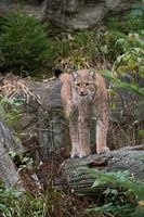 Lynx / Euraziatische lynx (Lynx lynx) in zijn natuurlijke omgeving, boeiend oogcontact, Europa.