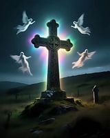 Een mystiek Iers kruis staat midden in een zacht glooiend landschap, verlicht door het zilveren licht van de volle maan. De steen is rijkelijk versierd met Keltische patronen, waarvan de gedetailleerde knopen en spiraalvormige ontwerpen intens oplichten in het maanlicht en een eeuwenoud verhaal vertellen. De zachte gloed van de maan…