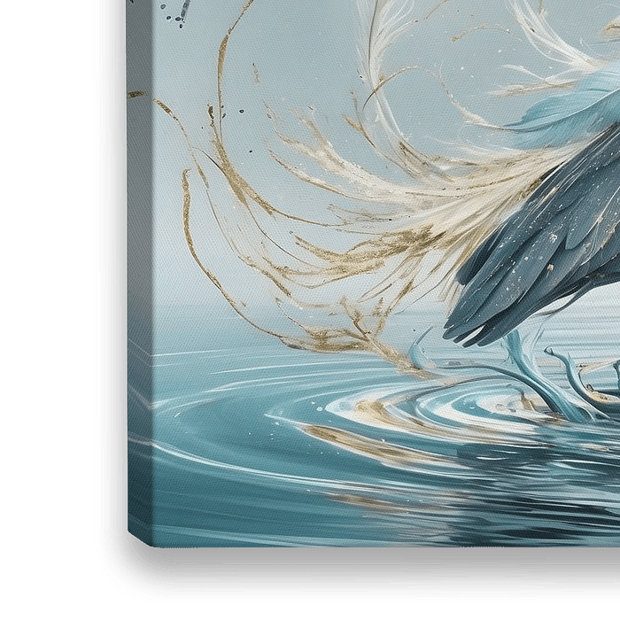 In vele culturen wordt de reiger gezien als een symbool van zelfvertrouwen, onafhankelijkheid en aanpassingsvermogen. Dit majestueuze kunstwerk nodigt je uit om de stroom van het leven te volgen, net zoals de reiger met gratie door het water beweegt. De combinatie van diepe blauwtinten, zilverachtige highlights en subtiele gouden details creëert een tijdloze compositie die rust en verfijning uitstraalt.