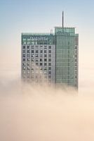 De Maastoren in Rotterdam gefotografeerd tijdens lage mist over de stad.