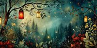 Een betoverend kunstwerk waar natuur en mystiek samensmelten in een schemering wereld vol warmte en wonder. Tussen imposante bomen en weelderige bloemen hangen gouden lantaarns die een intiem licht uitstralen, terwijl sterren en magische glimmeringen de donkergroene lucht vullen. Dit schilderij ademt een atmospheer van gezelligheid en…