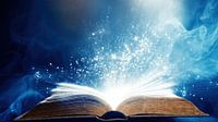 Deze illustratie toont een open boek waaruit een magisch, gloeiend licht stroomt, vergezeld van rook en fonkelende deeltjes. De donkere, blauwe achtergrond versterkt de mysterieuze en betoverende sfeer die de afbeelding creëert. Het licht dat uit de bladzijden van het boek komt, symboliseert kennis, geheimen en een diepe, verborgen…