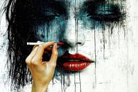 Deze indrukwekkende scène toont de hand van een visagist die met een penseel felrode lippen schildert op het gezicht van een vrouw - niet op haar echte gezicht, maar op een canvas. De compositie combineert op fascinerende wijze de wereld van cosmetica met klassieke schilderkunst en vervaagt de grenzen tussen schoonheidsverzorging en…