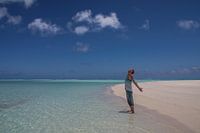 Man geniet van de zon terwijl hij met zijn voeten in het water staat van de paradijselijke turquoise baai van Aitutaki in de Cook Islands.