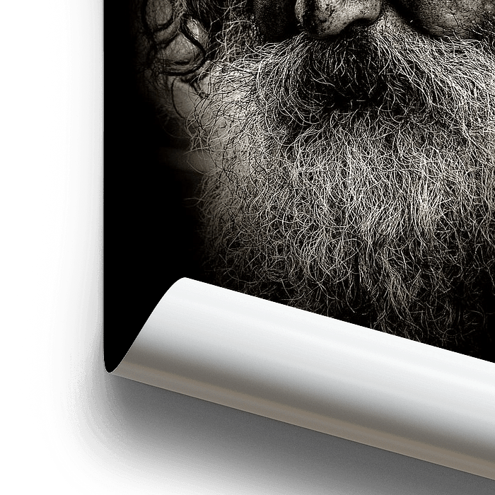 Clos-up foto, zwart-wit portretfoto van een man met een volle baard die in de camera kijkt met een karakteristiek hoofd.