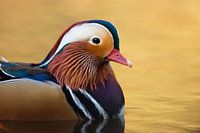Mandarin Duck / Mandarinente ( Aix galericulata ), colorful drake in breeding dress, close up, head shot, golden colored water, wildlife, Europe.