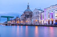 De Marekerk in Leiden in het vroege blauwe uurtje, gezien vanaf de Oude Vest. Een karakteristiek Leids beeld.