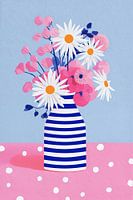 Een vrolijke illustratie van een marineblauw gestreepte vaas gevuld met een uitbundig boeket van witte madeliefjes en roze bloemen. De compositie staat op een roze tafel met witte stippen tegen een rustige lichtblauwe achtergrond, wat zorgt voor een speelse en moderne uitstraling met een vleugje retro charme.