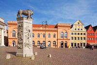 Marktplaats met leeuwenmonument en oud stadhuis, Schwerin