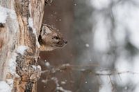 Pine Marten / Spruce Marten ( Martes americana ) kijkt uit zijn hol in een oude boom, wilde dieren, Yellowstone NP, USA. Grappig plaatje, leuke wintersfeer.