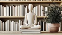 In deze kalme en contemplatieve scène zit een witte figuur vredig op een stapel boeken in het midden van een bibliotheek. De eenvoudige, meditatieve houding van de figuur straalt sereniteit en harmonie uit. Ernaast staat een plant die de kamer een vleugje natuur en leven geeft. De boeken staan voor kennis en wijsheid, terwijl de…