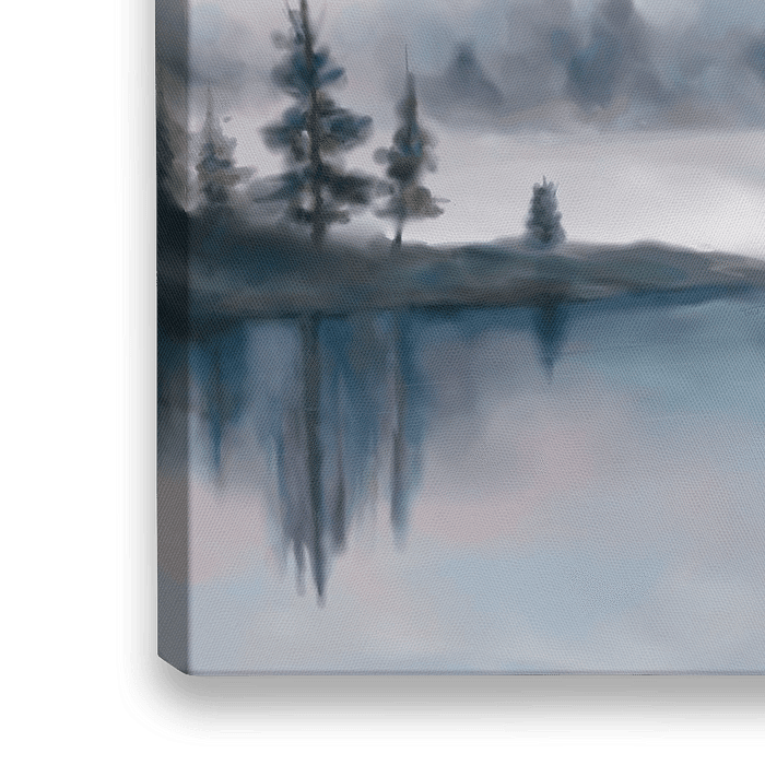 Aquarelschilderij van een meer met bomen op een mistige en koele vroege ochtend in neutrale grijze, blauwe, groene en licht roze kleuren.