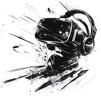 Deze dynamische zwart-wit tekening toont een headset met videobril die een meeslepende ervaring biedt. De sterke lijnen en contrasten vangen de futuristische esthetiek van de technologie en geven het een dynamische aanwezigheid. De afbeelding vangt het idee van technologie en vooruitgang, terwijl de duidelijke details van de koptelefoon…
