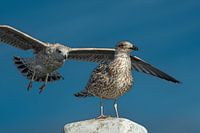 Terwijl de voorste meeuw rustig op de aanlegsteiger van de haven van Den Helder in Noord-Holland zit vliegt er op de achtergrond een andere meeuw naderbij.