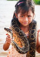 Cambodjaanse meisje met een slang (boa constrictor) om haar nek.