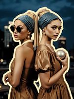 Twee meisjes met de parel, een knipoog naar het originele meesterwerk. Een meer grafische benadering van het onderwerp, met niet één maar twee meisjes, waarbij bovendien de ene een hele grote parel in haar hand heeft.
