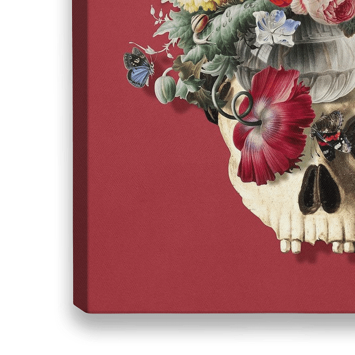 Stilleven met schedel, bloemen en vlinders en met licht 3D-effect, op rood/roze achtergrond.