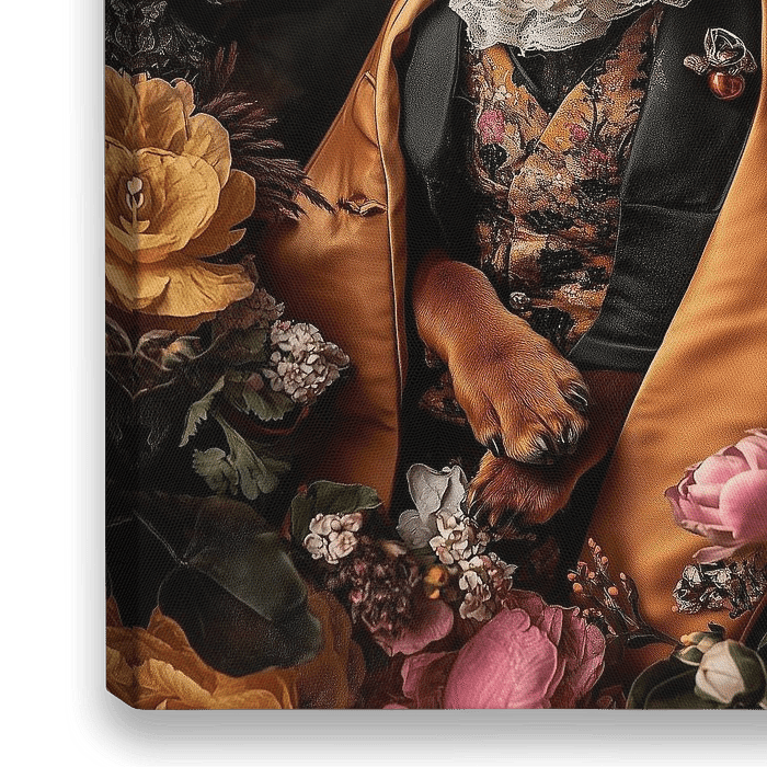 Portret van een teckel, in 18e eeuws kleding omringd door bloemen. Een grappig en klassiek portret.