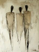 Mensen abstract | Mensen figuren - Op dit abstract schilderij zie je drie mensenfiguren in neutrale tinten, die sterk zijn weergegeven met lange, slanke vormen en vaag gedefinieerde gezichten, waardoor ze een gevoel van saamhorigheid uitstralen.