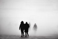 Mensen verdwijnen in de mist. Zwart wit fotografie tijdens een kunst evenement in Rotterdam bij de Van Nelle fabriek.