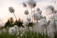 Harde wind waait door katoen gras, of wolsprietjes. Dagelijks leven in de duinen van Zweden. Fluffy wolsprieten.