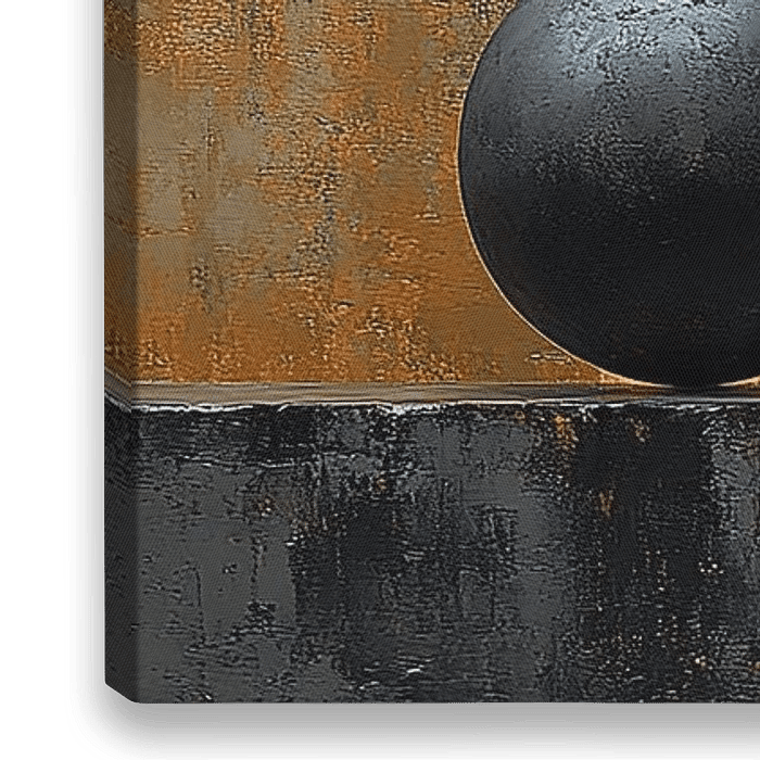 Metallic Ballen - Dit abstracte stilleven schilderij toont vier elegante sferen, geordend van links naar rechts, afwisselend in matzwart en glanzend goud, tegen een rich textuurschilderij achtergrond in schakeringen van goud en umber.