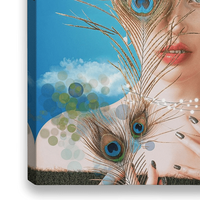 Mind's eye; een dromerig, prachtig en uniek ontwerp van een vrouw met pauwenveren, wolken en een vlucht vogels.