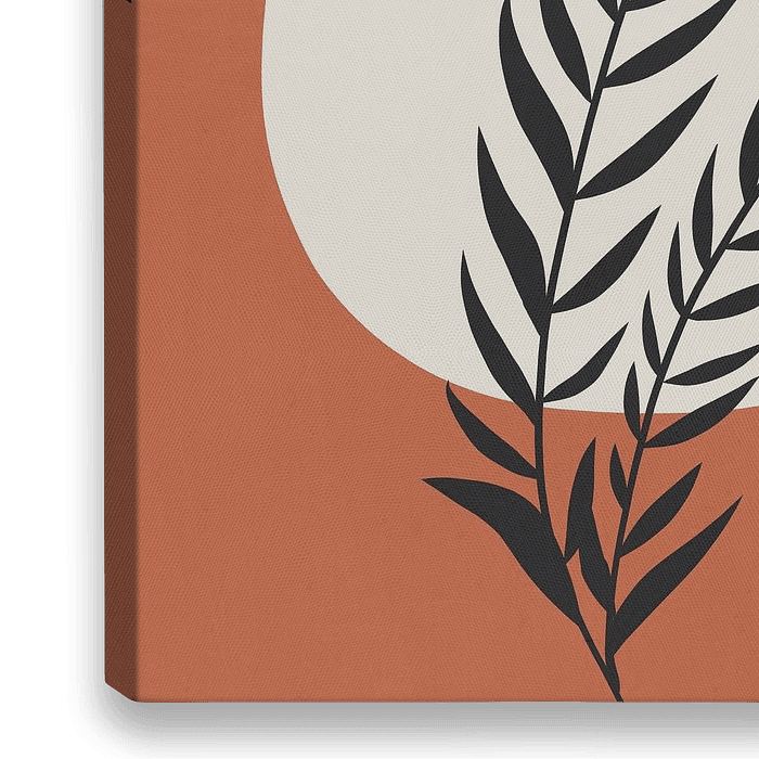 Minimalistische, botanische print. De achtergrond is terracotta van kleur. De organische vorm zorgt voor een mooi contrast met het takje en de achtergrond. Een leuke abstracte print voor ieder interieur.