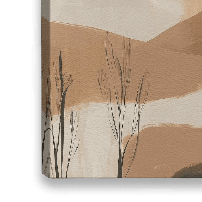 Dit minimalistisch landschap met heuvels en riet brengt natuurlijke rust in je interieur. Perfect als wanddecoratie voor woonkamer, slaapkamer of kantoor. Het exclusieve digitale kunstwerk wordt op maat gemaakt en toont zachte heuvels die samensmelten met elegante rietstengels in warme aardse tinten.