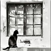 In een sfeervolle zwart-witafbeelding staat een majestueuze zwarte kat centraal, zittend voor een raam met een uitdrukking die de eeuwenoude geheimen van de nacht lijkt te dragen. Het contrast tussen de diepe duisternis van zijn vacht en het licht dat door het raam valt, creëert een dramatisch effect dat de aandacht trekt.