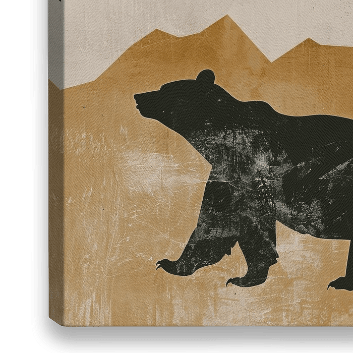 Over ‘Minimalistische weergave van beer en bergen bij zonsondergang’ van Art & Soul Creations