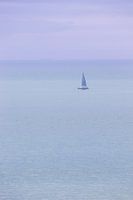 Een eenzame zeilboot glijdt over de vredige kalme oceaan, tegen een achtergrond van zachte pastelkleuren van lavendel en lichtblauw. Ontsnap aan de stress van alledag en voel je in vrede met de uitgestrektheid van de natuur.