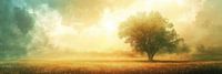 Mistige Boom - In dit landschap schilderij zie je een grote boom die staat in een gouden veld, omringd door mist en een warme, zachte lucht in verschillende tinten van groen en geel.