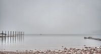 Hoog in de Japanse bergen liep ik door de dichte mist langs een meertje waarbij ik dit dromerige beeld kon fotograferen. Een vissersbootje voer voorbij en nam een mooie plaats in tussen twee pieren.