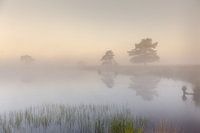 Tijdens de ochtenden en avonden kunnen er mooie kleurrijke sfeermomenten zijn. Dit moment in Drenthe ook en dat werkt helemaal perfect met een spiegeling van bomen en de mistlagen over het ven.