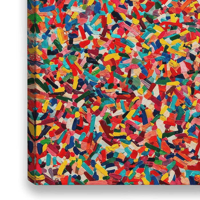 Een zeer gedetailleerd, levendig abstract mozaïek, samengesteld uit talloze kleine, onregelmatig gevormde, veelkleurige fragmenten die dicht op elkaar gepakt zijn. De compositie kenmerkt zich door een chaotische maar harmonieuze rangschikking van minuscule, penseelstreekachtige elementen in diverse heldere en pastelkleuren. Het beeld…