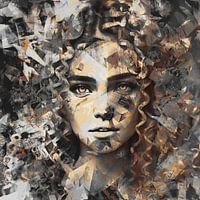 Dit portret van een jonge vrouw is digitaal geschilderd met gemengde technieken. Dit mixed media werk is gemaakt uit veel verschillende lagen die elk hun eigen textuur overbrengen. Grijs, goud geel en zwart zijn de basis kleuren voor dit werk. Door deze kleuren op een slimme manier met elkaar te mengen ontstaat een suggestie van goud en zilver.