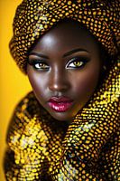 Dit prachtige studioportret toont een indrukwekkend Afro-Amerikaans mode-icoon dat fascineert met haar krachtige charisma en stijlvolle houding. Haar stralende make-up benadrukt haar expressieve gelaatstrekken, terwijl de gouden hoofddoek haar elegantie en gratie onderstreept. De levendige gele achtergrond versterkt de stralende…