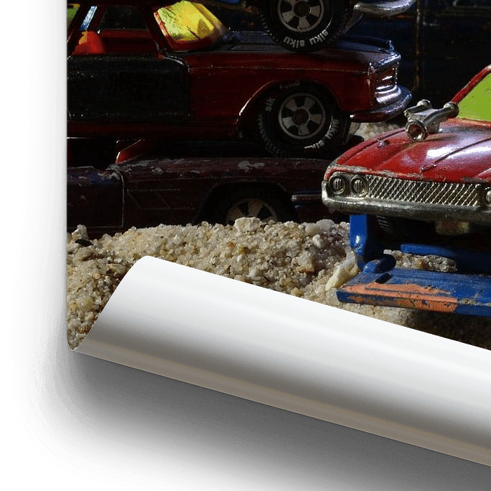 Lost Place of Miniatures Kinderen en verzamelaars keken ooit met stralende ogen naar en verwonderden zich over hun verworvenheden. Ze zullen deze emoties terugvinden in mijn foto's. Ik kon deze exemplaren herontdekken op een klein autokerkhof. Breng je dromen terug met deze bijzondere wanddecoratie.