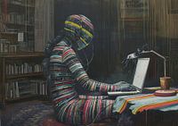 Details: gestreept, figuur, lezen, interieur, boekenkast, laptop, tafellamp, kleurrijk, boek, kunst