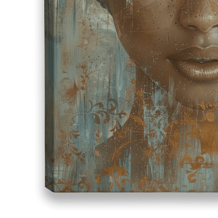 Modern abstract en chic portret. Kies zelf het formaat en materiaal bij dit werk en maak er een echte blikvanger van voor jouw interieur. In blauw en goud.