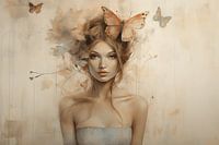 Modern chic portret met een zachte, poëtische uitstraling. Een jonge vrouw wordt omringd door een aantal vlinders. Aardetinten in de stijl nieuw landelijk.