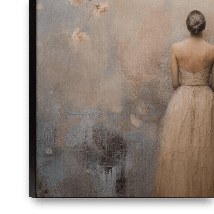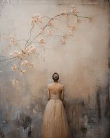 Modern en chic digital art portret "Blossom girl". Een bijzonder portret van een vrouw met een knotje vanaf haar rug gezien in zachte kleuren met een romantische en poëtische uitstraling. Omring door bloemen, bloesem in pastelkleuren.