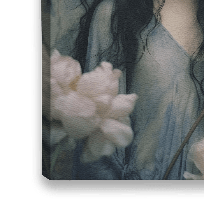 Modern portret "Pioenrozen". Een donkerharige vrouw met lang haar staat midden tussen de pioenrozen. Een bijzonder, poëtisch en uniek werk in pastelkleuren.