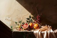 Modern stilleven met harde schaduwen. Helemaal van nu! Een stilleven op een zomerse dag, waan je op vakantie met dit zonnige kunstwerk van fruit in terracotta tinten.