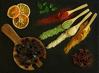 Cheerful still-life with spices, herbs,black olives, dried oranges and basil.