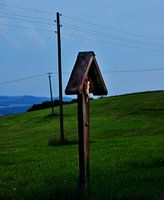 Christusbeeldje onder een houten afdakje geflankeerd door telefoonpalen